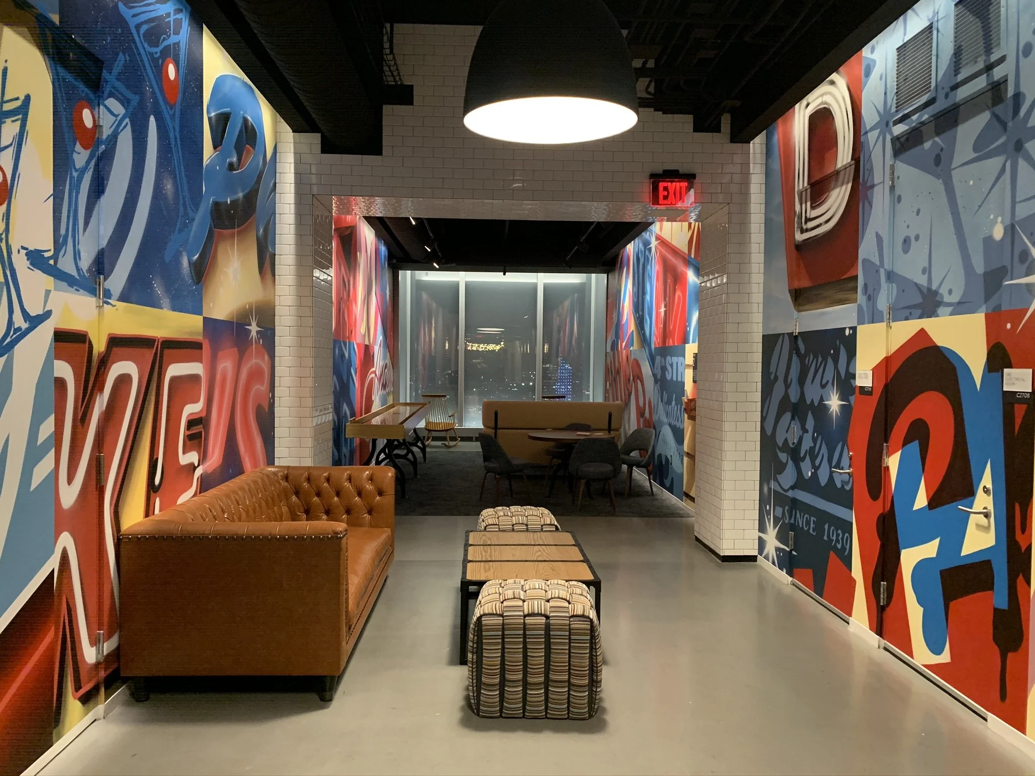 Only a few month’s earlier, James single-handedly painted THREE massive 100ft long hallways on Floors 29, 30, 31! Here he used his signature Word Collage styling to give a colorful Philly-centric wall paper as a massive accent wall. Check out the articles below for more info!