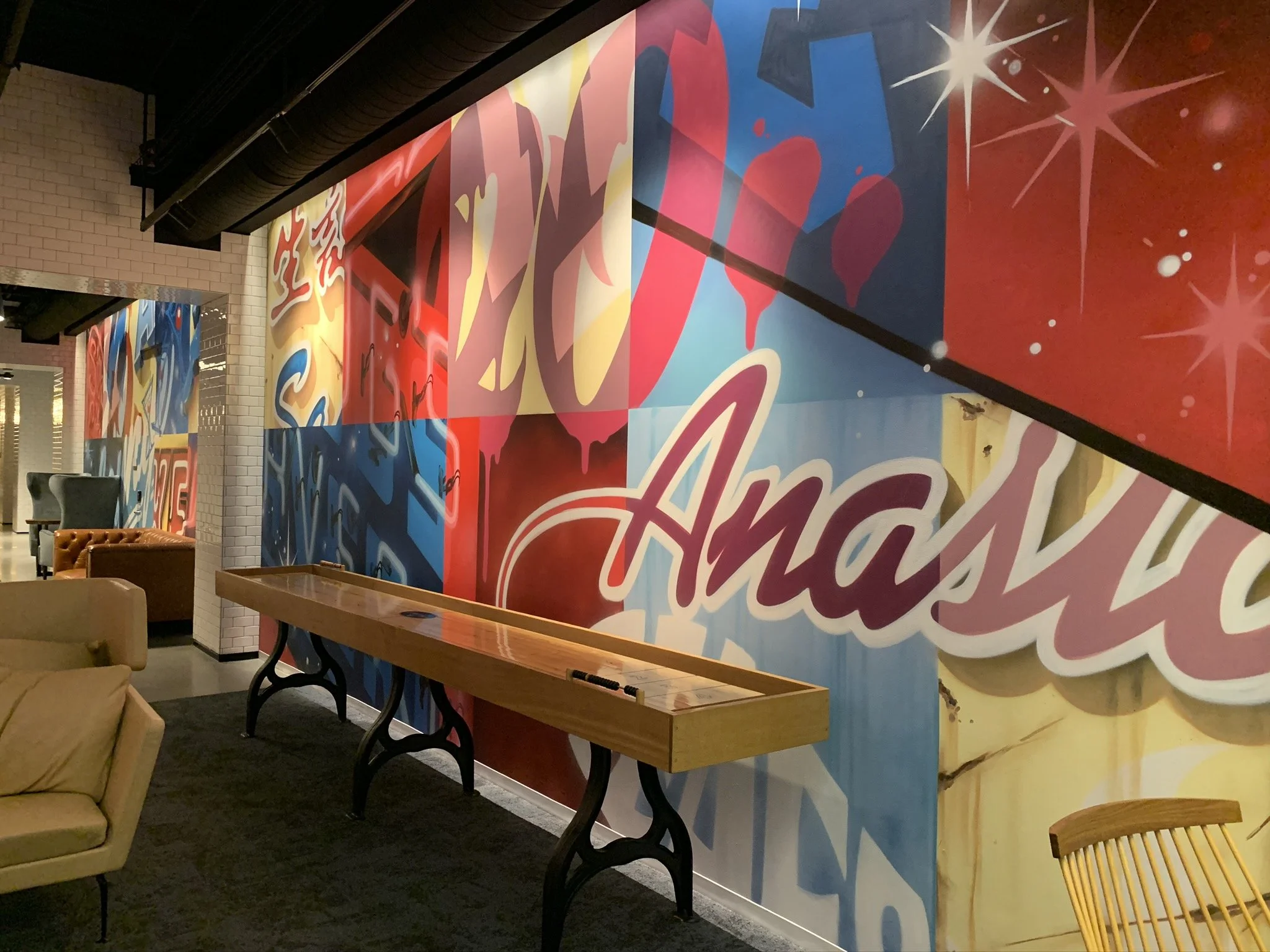 The Comcast Technology Center hand-selected James to spray paint this graffiti infused, iconic Philly signage collage for their Market Place luncheon hang-out. The mural artist pulled specific logos, signage, and branding from all parts of Philadelphia including South Philly, West Philly, China Town, and Center City. He specifically cherry picked Philadelphia’s cultural landmarks, mixed in some popular bars & restaurants, and twisted it all together with his unique graffiti touches. He chose a simple color palette in order to contain the various elements to create a warm/cool vibe that is easy on the eye for this playful area. The final piece of artwork tells a story of historic Philadelphia, using signage typography that breaks through barriers; literally and metaphorically.